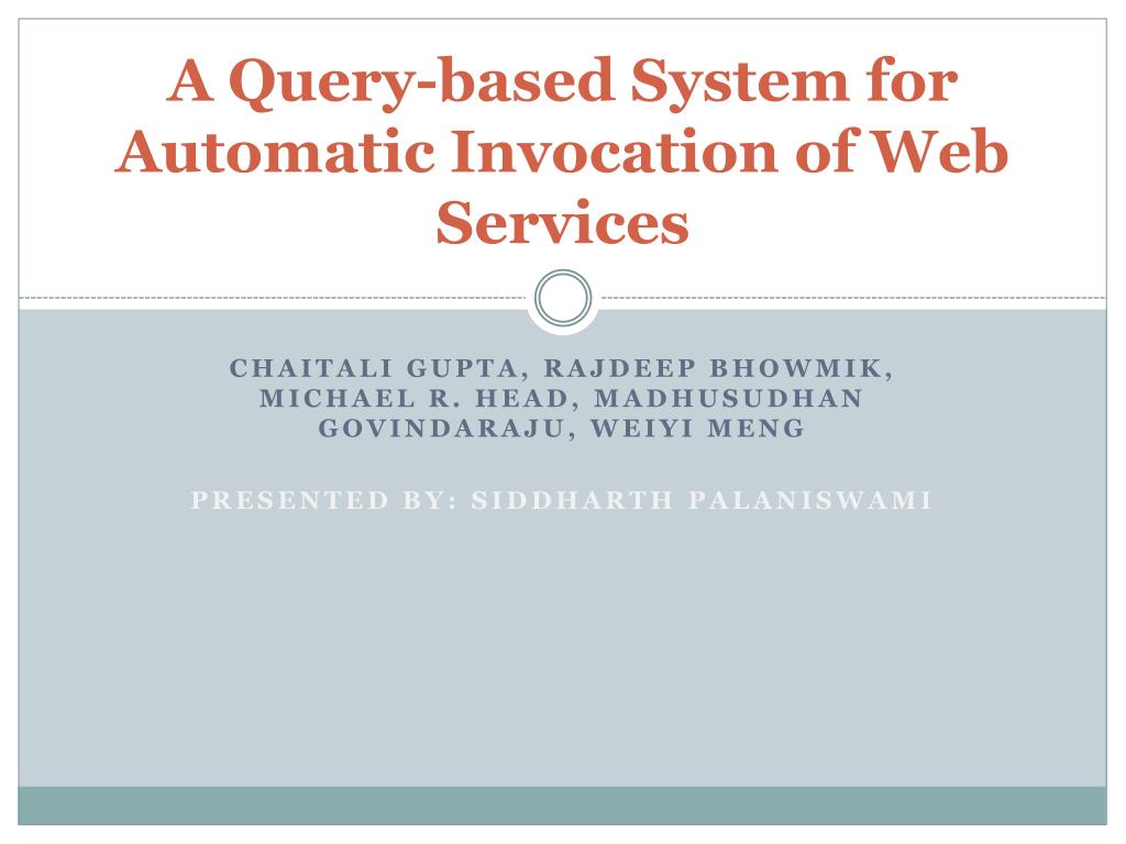 A Query-based System for Automatic Invocation of Web Services Chaitali Gupta, RajdeepBhowmik, Michael R. Head, MadhusudhanGovindaraju, WeiyiMeng Presented By: SiddharthPalaniswami