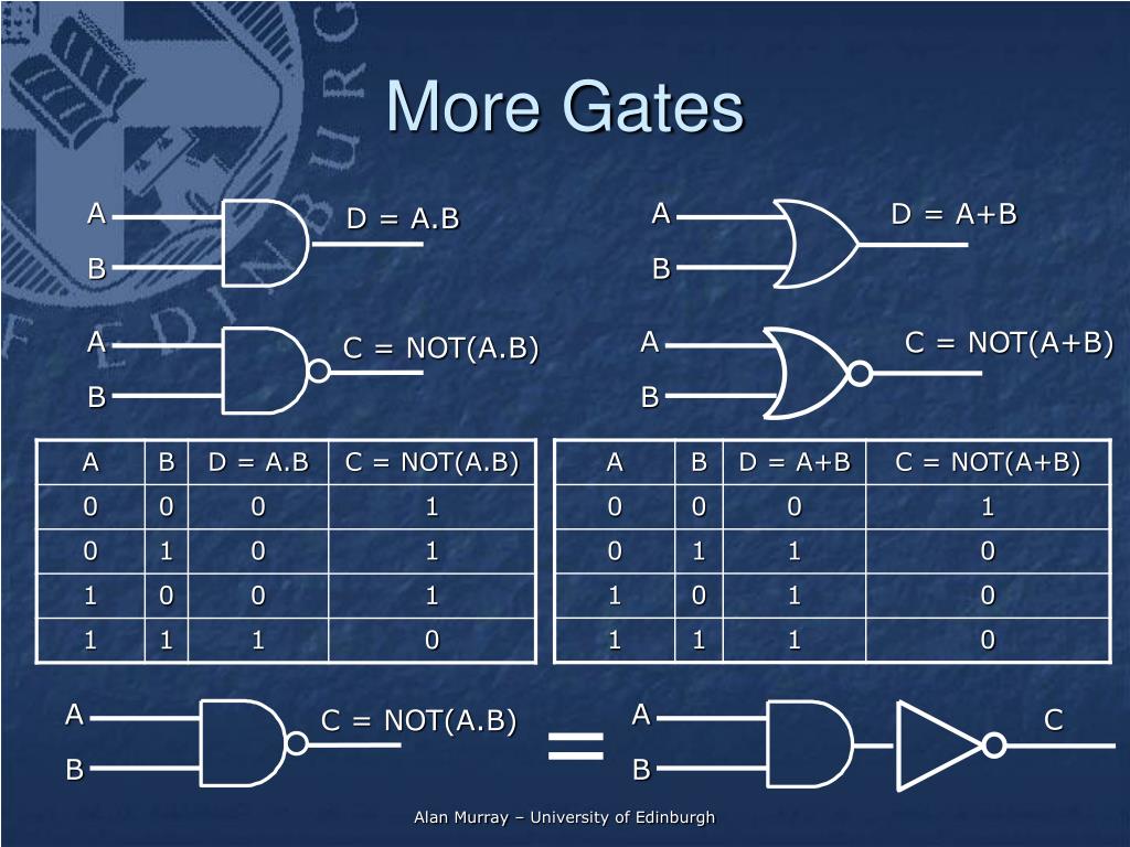 A A D = A+B D = A.B B B A A A C = NOT(A+B) C = NOT(A.B) C = NOT(A.B) B B B A C B More Gates = Alan Murray – University of Edinburgh