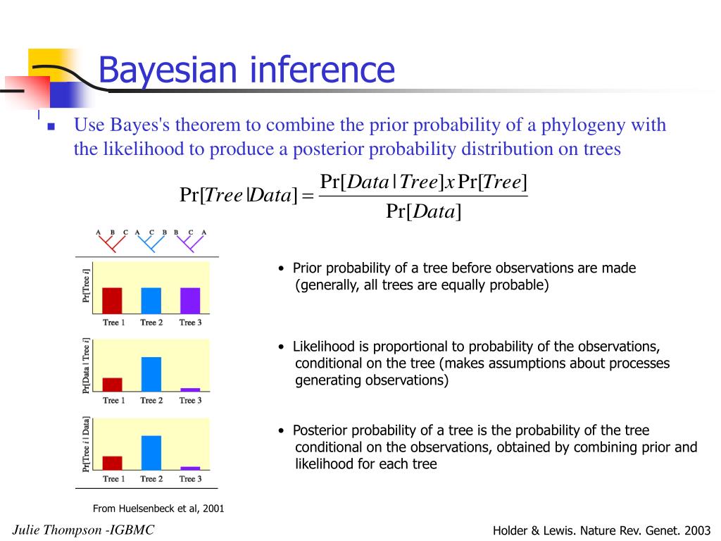 Bayesian inference • Use Bayes's theorem to combine the prior probability of a phylogeny with the likelihood to produce a posterior probability distribution on trees • Prior probability of a tree before observations are made • (generally, all trees are equally probable) • Likelihood is proportional to probability of the observations, • conditional on the tree (makes assumptions about processes • generating observations) • Posterior probability of a tree is the probability of the tree • conditional on the observations, obtained by combining prior and • likelihood for each tree From Huelsenbeck et al, 2001 Holder & Lewis. Nature Rev. Genet. 2003