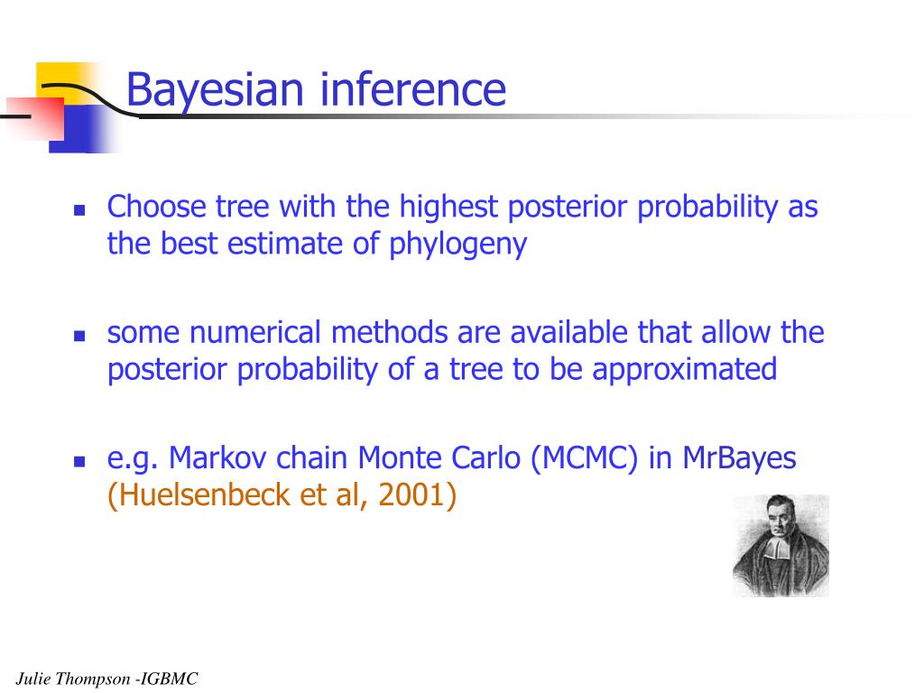 Bayesian inference • Choose tree with the highest posterior probability as the best estimate of phylogeny • some numerical methods are available that allow the posterior probability of a tree to be approximated • e.g. Markov chain Monte Carlo (MCMC) in MrBayes (Huelsenbeck et al, 2001)