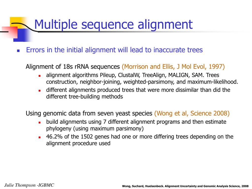 Multiple sequence alignment • Errors in the initial alignment will lead to inaccurate trees Alignment of 18s rRNA sequences (Morrison and Ellis, J Mol Evol, 1997) • alignment algorithms Pileup, ClustalW, TreeAlign, MALIGN, SAM. Trees construction, neighbor-joining, weighted-parsimony, and maximum-likelihood. • different alignments produced trees that were more dissimilar than did the different tree-building methods Using genomic data from seven yeast species (Wong et al, Science 2008) • build alignments using 7 different alignment programs and then estimate phylogeny (using maximum parsimony) • 46.2% of the 1502 genes had one or more differing trees depending on the alignment procedure used Wong, Suchard, Huelsenbeck. Alignment Uncertainty and Genomic Analysis Science, 2008