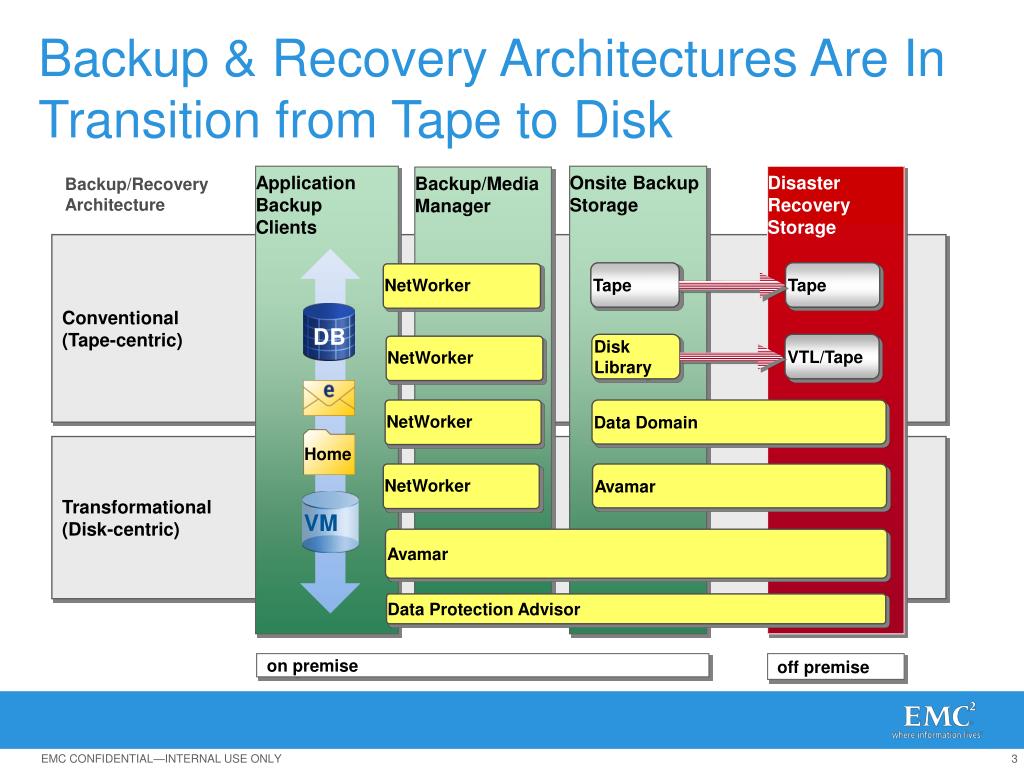 Backup & Recovery Architectures Are In Transition from Tape to Disk Tape Tape NetWorker Disk Library VTL/Tape NetWorker NetWorker Data Domain VM Application Backup Clients Onsite Backup Storage Disaster Recovery Storage Backup/Media Manager Backup/Recovery Architecture Conventional(Tape-centric) DB Transformational (Disk-centric) NetWorker Avamar Home Avamar Data Protection Advisor on premise off premise