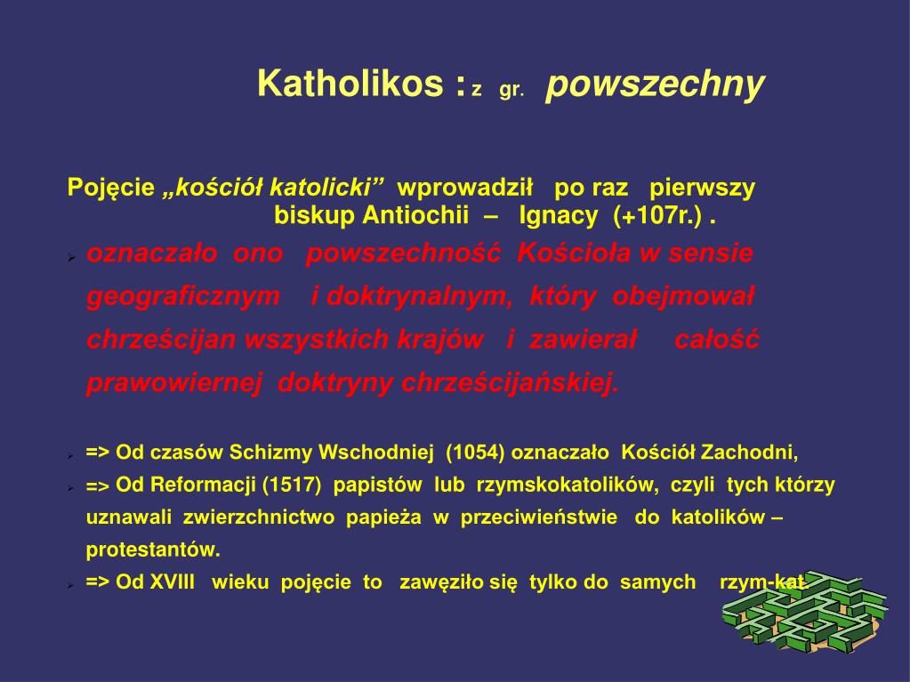 Katholikos : z gr.powszechny • Pojęcie „kościół katolicki” wprowadził po raz pierwszy biskup Antiochii – Ignacy (+107r.) . • oznaczało ono powszechność Kościoła w sensie geograficznym i doktrynalnym, który obejmował chrześcijan wszystkich krajów i zawierał całość prawowiernej doktryny chrześcijańskiej. • => Od czasów Schizmy Wschodniej (1054) oznaczało Kościół Zachodni, • => Od Reformacji (1517) papistów lub rzymskokatolików, czyli tych którzy uznawali zwierzchnictwo papieża w przeciwieństwie do katolików – protestantów. • => Od XVIII wieku pojęcie to zawęziło się tylko do samych rzym-kat.
