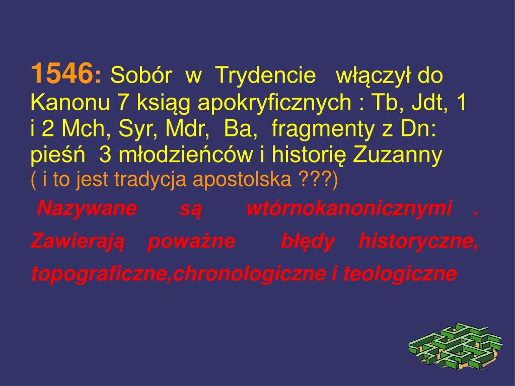 1546:Sobór w Trydencie włączył do Kanonu 7 ksiąg apokryficznych : Tb, Jdt, 1 i 2 Mch, Syr, Mdr, Ba, fragmenty z Dn: pieśń 3 młodzieńców i historię Zuzanny ( i to jest tradycja apostolska ???) Nazywane są wtórnokanonicznymi . Zawierają poważne błędy historyczne, topograficzne,chronologiczne i teologiczne