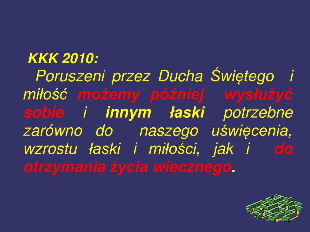 KKK 2010: Poruszeni przez Ducha Świętego i miłośćmożemy później wysłużyć sobie i innym łaski potrzebne zarówno do naszego uświęcenia, wzrostu łaski i miłości, jak ido otrzymania życia wiecznego.