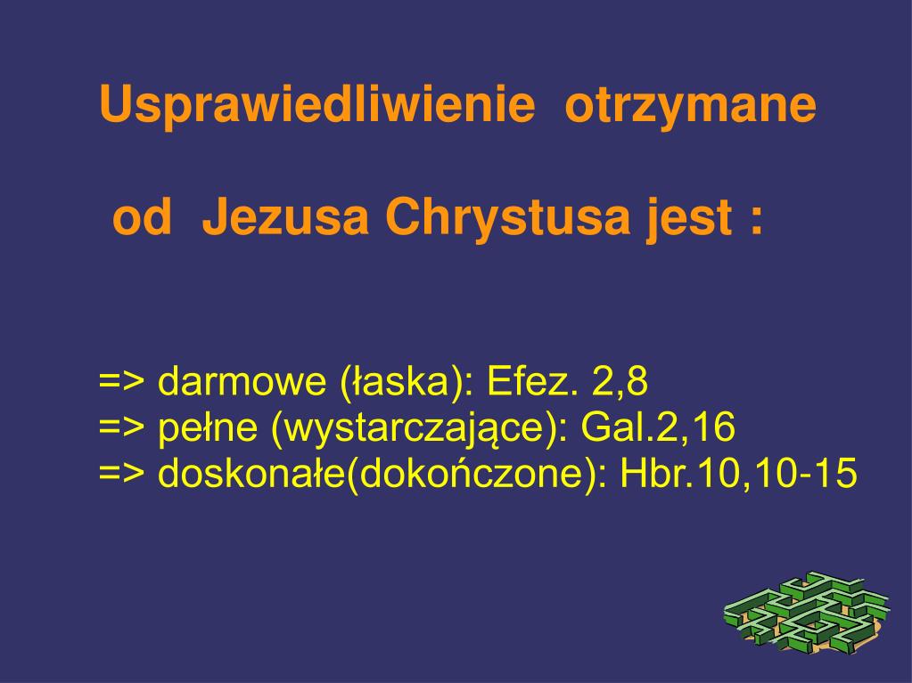 Usprawiedliwienie otrzymane od Jezusa Chrystusa jest : => darmowe (łaska): Efez. 2,8 => pełne (wystarczające): Gal.2,16 => doskonałe(dokończone): Hbr.10,10-15