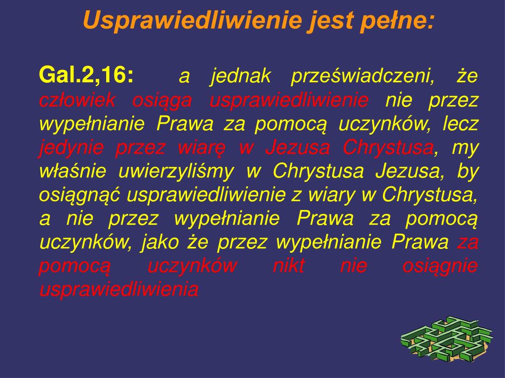 Usprawiedliwienie jest pełne: Gal.2,16: a jednak przeświadczeni, że człowiek osiąga usprawiedliwienie nie przez wypełnianie Prawa za pomocą uczynków, lecz jedynie przez wiarę w Jezusa Chrystusa, my właśnie uwierzyliśmy w Chrystusa Jezusa, by osiągnąć usprawiedliwienie z wiary w Chrystusa, a nie przez wypełnianie Prawa za pomocą uczynków, jako że przez wypełnianie Prawa za pomocą uczynków nikt nie osiągnie usprawiedliwienia
