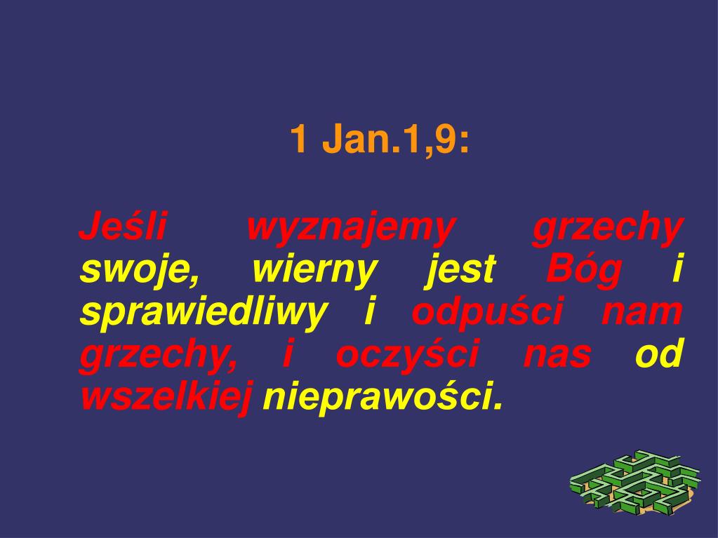 1 Jan.1,9: Jeśli wyznajemy grzechy swoje, wierny jest Bóg i sprawiedliwy i odpuści nam grzechy, i oczyści nas od wszelkiej nieprawości.