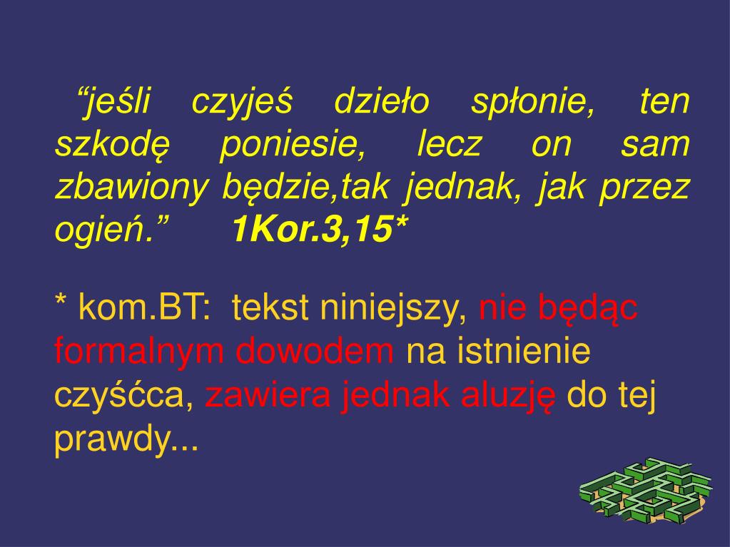 “jeśli czyjeś dzieło spłonie, ten szkodę poniesie, lecz on sam zbawiony będzie,tak jednak, jak przez ogień.” 1Kor.3,15* * kom.BT: tekst niniejszy, nie będąc formalnym dowodem na istnienie czyśćca, zawiera jednak aluzję do tej prawdy...