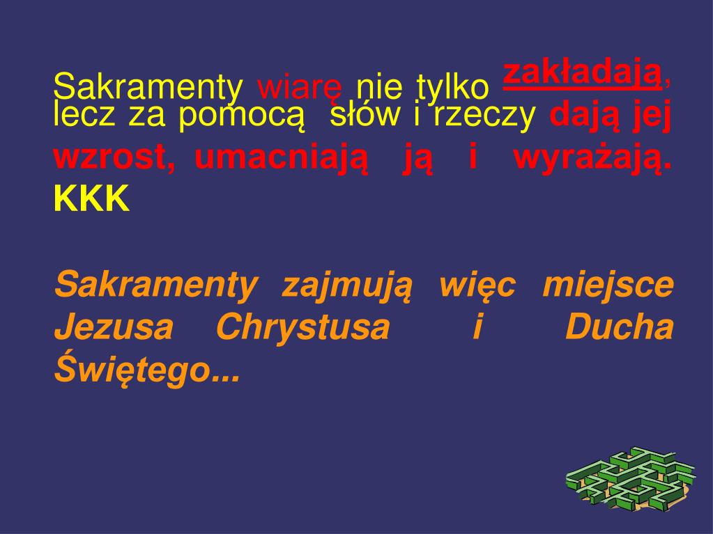 Sakramenty wiarę nie tylko zakładają, lecz za pomocą słów i rzeczy dają jej wzrost,umacniają ją i wyrażają. KKK Sakramenty zajmują więc miejsce Jezusa Chrystusa i Ducha Świętego...