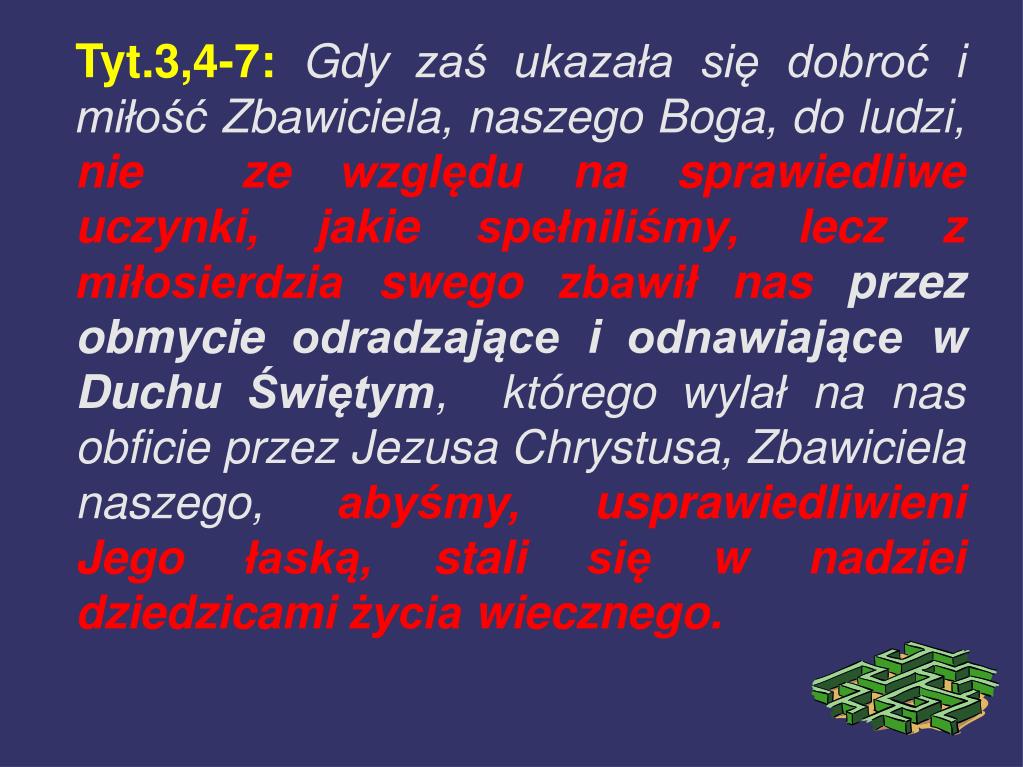 Tyt.3,4-7:Gdy zaś ukazała się dobroć i miłość Zbawiciela, naszego Boga, do ludzi, nie ze względu na sprawiedliwe uczynki, jakie spełniliśmy, lecz z miłosierdzia swego zbawił nas przez obmycie odradzające i odnawiające w Duchu Świętym, którego wylał na nas obficie przez Jezusa Chrystusa, Zbawiciela naszego, abyśmy, usprawiedliwieni Jego łaską, stali się w nadziei dziedzicami życia wiecznego.