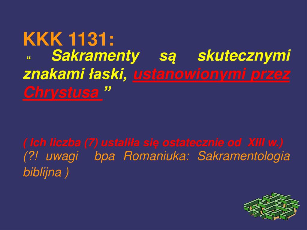 KKK 1131: “ Sakramenty są skutecznymi znakami łaski, ustanowionymi przez Chrystusa ” ( Ich liczba (7) ustaliła się ostatecznie od XIII w.) (?! uwagi bpa Romaniuka: Sakramentologia biblijna )