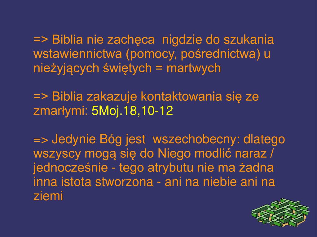=> Biblia nie zachęca nigdzie do szukania wstawiennictwa (pomocy, pośrednictwa) u nieżyjących świętych = martwych => Biblia zakazuje kontaktowania się ze zmarłymi: 5Moj.18,10-12 => Jedynie Bóg jest wszechobecny: dlatego wszyscy mogą się do Niego modlić naraz / jednocześnie - tego atrybutu nie ma żadna inna istota stworzona - ani na niebie ani na ziemi