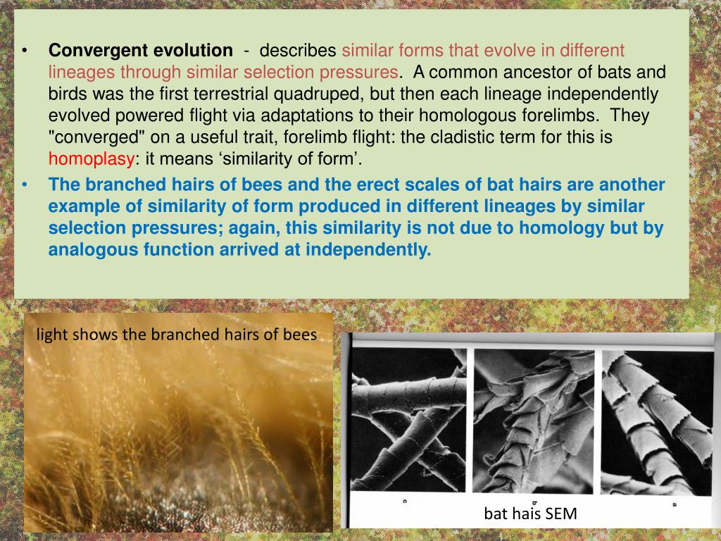 Convergent evolution - describes similar forms that evolve in different lineages through similar selection pressures. A common ancestor of bats and birds was the first terrestrial quadruped, but then each lineage independently evolved powered flight via adaptations to their homologous forelimbs. They "converged" on a useful trait, forelimb flight: the cladistic term for this is homoplasy: it means ‘similarity of form’. • The branched hairs of bees and the erect scales of bat hairs are another example of similarity of form produced in different lineages by similar selection pressures; again, this similarity is not due to homology but by analogous function arrived at independently. light shows the branched hairs of bees bat hais SEM