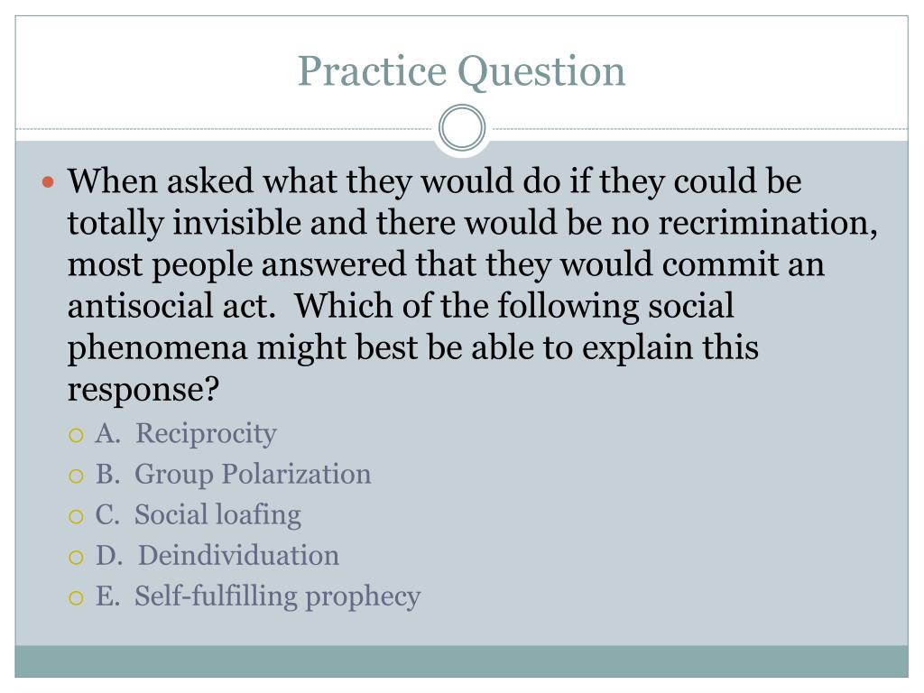 Practice Question • When asked what they would do if they could be totally invisible and there would be no recrimination, most people answered that they would commit an antisocial act. Which of the following social phenomena might best be able to explain this response? • A. Reciprocity • B. Group Polarization • C. Social loafing • D. Deindividuation • E. Self-fulfilling prophecy