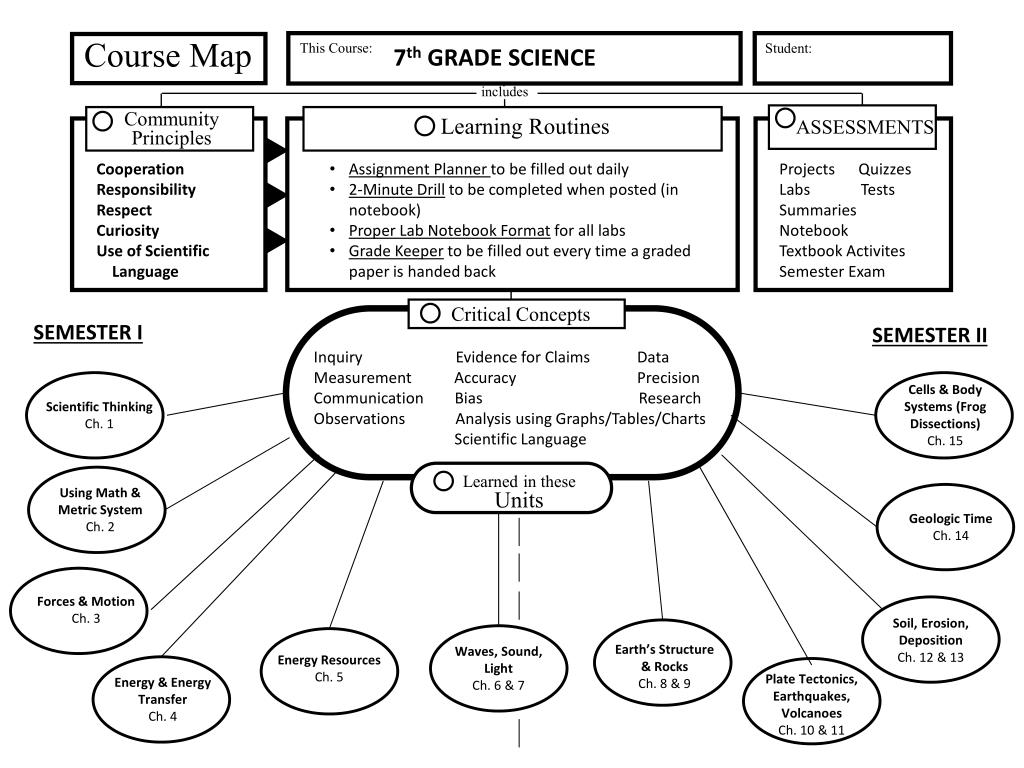 Course Map This Course: Student: includes Community Principles Learning Routines ASSESSMENTS Critical Concepts Learned in these Units 7th GRADE SCIENCE Cooperation Responsibility Respect Curiosity Use of Scientific Language • Assignment Planner to be filled out daily • 2-Minute Drill to be completed when posted (in notebook) • Proper Lab Notebook Format for all labs • Grade Keeper to be filled out every time a graded paper is handed back Projects Quizzes Labs Tests Summaries Notebook Textbook Activites Semester Exam SEMESTER I SEMESTER II Inquiry Evidence for Claims Data Measurement Accuracy Precision Communication Bias Research Observations Analysis using Graphs/Tables/Charts Scientific Language Cells & Body Systems (Frog Dissections) Ch. 15 Scientific Thinking Ch. 1 Using Math & Metric System Ch. 2 Geologic Time Ch. 14 Forces & Motion Ch. 3 Soil, Erosion, Deposition Ch. 12 & 13 Earth’s Structure & Rocks Ch. 8 & 9 Waves, Sound, Light Ch. 6 & 7 Energy Resources Ch. 5 Plate Tectonics, Earthquakes, Volcanoes Ch. 10 & 11 Energy & Energy Transfer Ch. 4