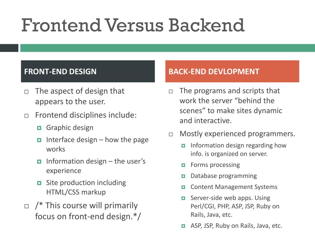 Frontend Versus Backend FRONT-END DESIGN BACK-END DEVLOPMENT • The aspect of design that appears to the user. • Frontend disciplines include: • Graphic design • Interface design – how the page works • Information design – the user’s experience • Site production including HTML/CSS markup • /* This course will primarily focus on front-end design.*/ • The programs and scripts that work the server “behind the scenes” to make sites dynamic and interactive. • Mostly experienced programmers. • Information design regarding how info. is organized on server. • Forms processing • Database programming • Content Management Systems • Server-side web apps. Using Perl/CGI, PHP, ASP, JSP, Ruby on Rails, Java, etc. • ASP, JSP, Ruby on Rails, Java, etc.