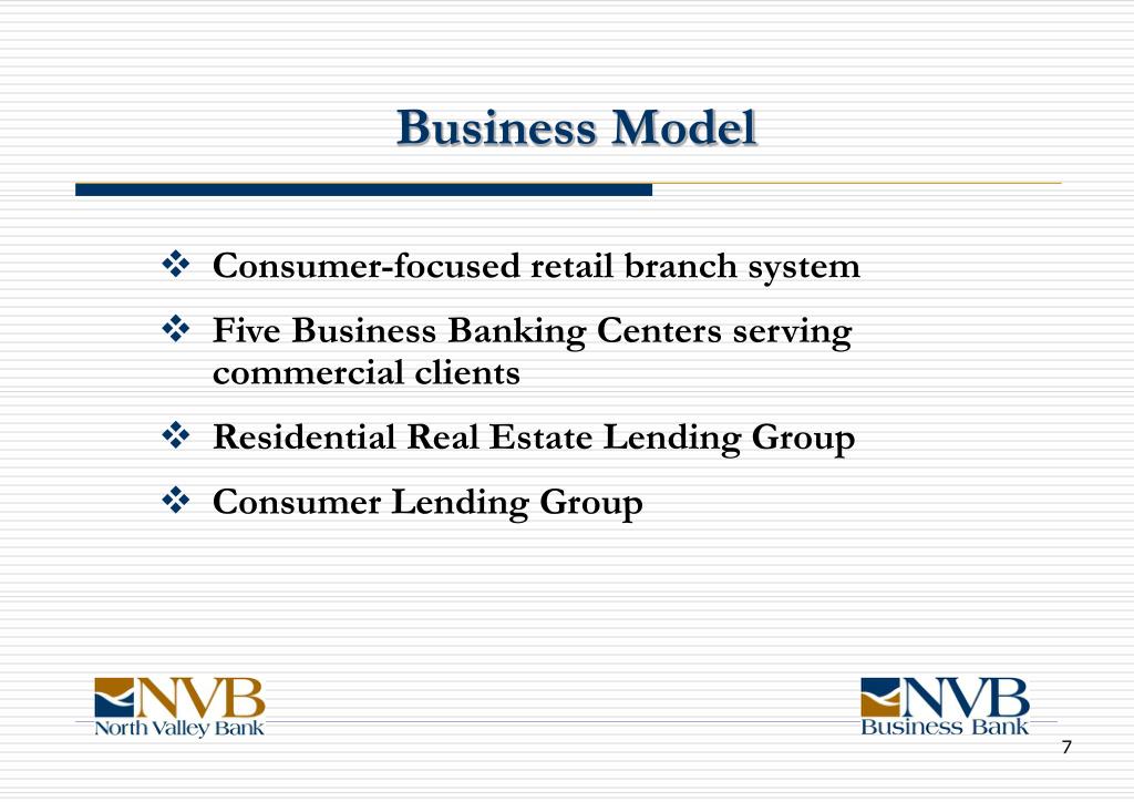Business Model • Consumer-focused retail branch system • Five Business Banking Centers serving commercial clients • Residential Real Estate Lending Group • Consumer Lending Group