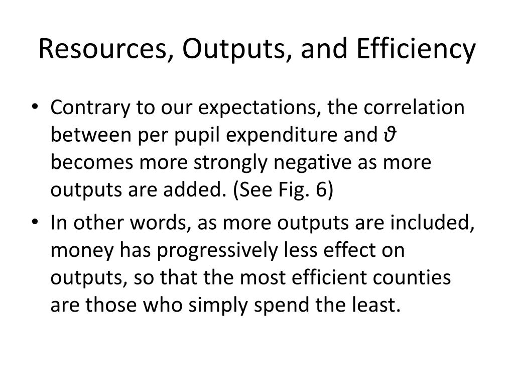 Resources, Outputs, and Efficiency • Contrary to our expectations, the correlation between per pupil expenditure and θ becomes more strongly negative as more outputs are added. (See Fig. 6) • In other words, as more outputs are included, money has progressively less effect on outputs, so that the most efficient counties are those who simply spend the least.