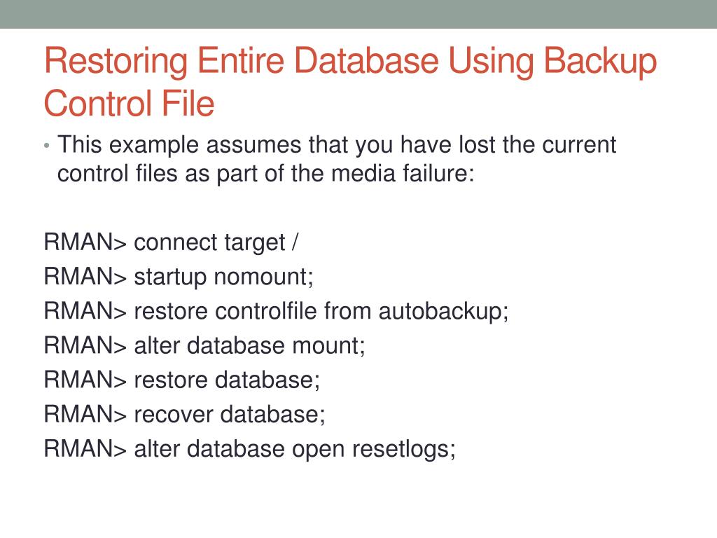 Restoring Entire Database Using Backup Control File • This example assumes that you have lost the current control files as part of the media failure: RMAN> connect target / RMAN> startup nomount; RMAN> restore controlfile from autobackup; RMAN> alter database mount; RMAN> restore database; RMAN> recover database; RMAN> alter database open resetlogs;