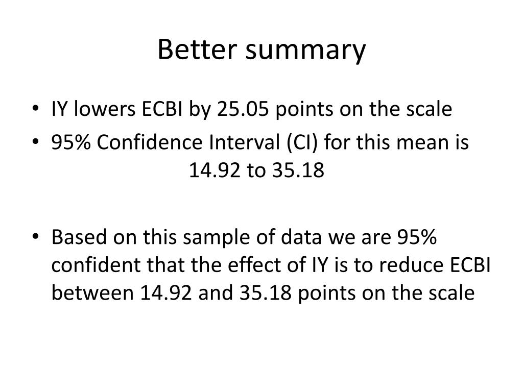 Better summary • IY lowers ECBI by 25.05 points on the scale • 95% Confidence Interval (CI) for this mean is 14.92 to 35.18 • Based on this sample of data we are 95% confident that the effect of IY is to reduce ECBI between 14.92 and 35.18 points on the scale