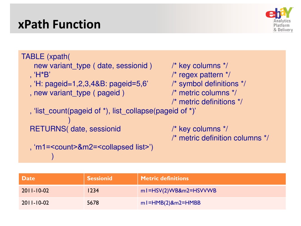 xPath Function • TABLE (xpath( • new variant_type ( date, sessionid) /* key columns */ • , ‘H*B’ /* regex pattern */ • , ‘H: pageid=1,2,3,4&B: pageid=5,6’/* symbol definitions */ • , new variant_type ( pageid ) /* metric columns */ • /* metric definitions */ • , ‘list_count(pageid of *), list_collapse(pageid of *)’ • ) • RETURNS( date, sessionid/* key columns */ • /* metric definition columns */ • , ‘m1=<count>&m2=<collapsed list>’) • )
