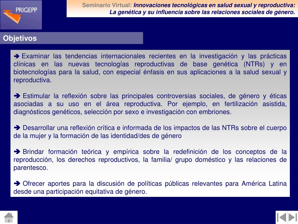 Seminario Virtual: Innovaciones tecnológicas en salud sexual y reproductiva: La genética y su influencia sobre las relaciones sociales de género. Objetivos • Examinar las tendencias internacionales recientes en la investigación y las prácticas clínicas en las nuevas tecnologías reproductivas de base genética (NTRs) y en biotecnologías para la salud, con especial énfasis en sus aplicaciones a la salud sexual y reproductiva. • Estimular la reflexión sobre las principales controversias sociales, de género y éticas asociadas a su uso en el área reproductiva. Por ejemplo, en fertilización asistida, diagnósticos genéticos, selección por sexo e investigación con embriones. • Desarrollar una reflexión crítica e informada de los impactos de las NTRs sobre el cuerpo de la mujer y la formación de las identidad/des de género • Brindar formación teórica y empírica sobre la redefinición de los conceptos de la reproducción, los derechos reproductivos, la familia/ grupo doméstico y las relaciones de parentesco. • Ofrecer aportes para la discusión de políticas públicas relevantes para América Latina desde una participación equitativa de género.