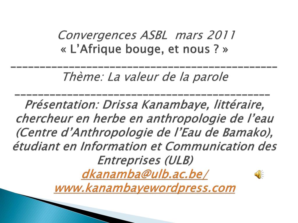 Convergences ASBL mars 2011« L’Afrique bouge, et nous ? »______________________________________________Thème: La valeur de la parole____________________________________________Présentation: Drissa Kanambaye, littéraire, chercheur en herbe en anthropologie de l’eau (Centre d’Anthropologie de l’Eau de Bamako), étudiant en Information et Communication des Entreprises (ULB) dkanamba@ulb.ac.be/www.kanambayewordpress.com