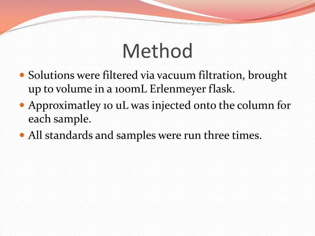 Method • Solutions were filtered via vacuum filtration, brought up to volume in a 100mL Erlenmeyer flask. • Approximatley 10 uL was injected onto the column for each sample. • All standards and samples were run three times.