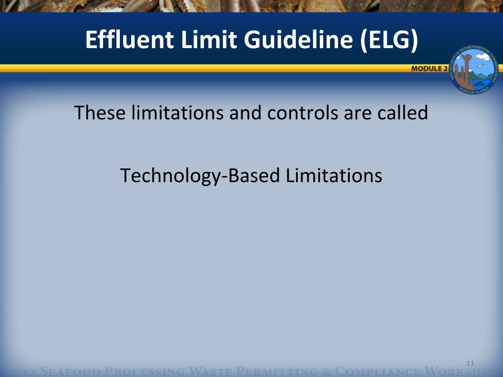 Effluent Limit Guideline (ELG) These limitations and controls are called Technology-Based Limitations 11