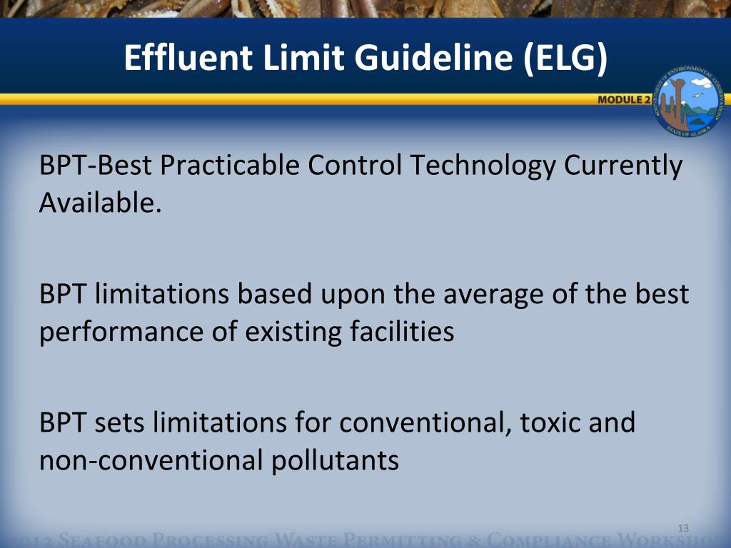 Effluent Limit Guideline (ELG) BPT-Best Practicable Control Technology Currently Available. BPT limitations based upon the average of the best performance of existing facilities BPT sets limitations for conventional, toxic and non-conventional pollutants 13