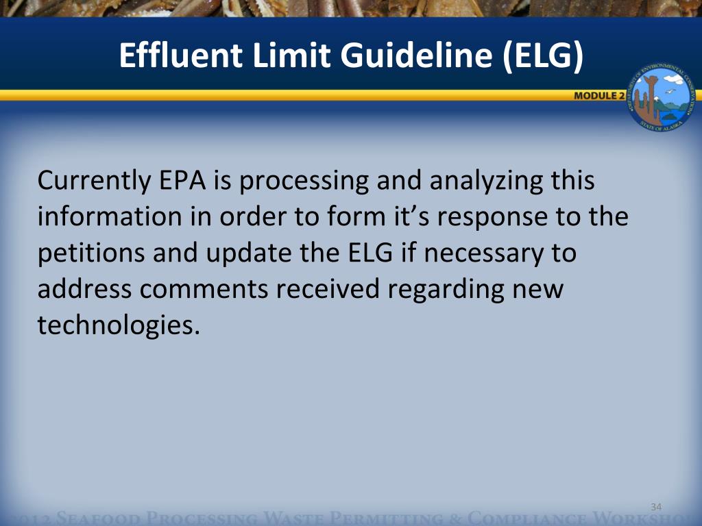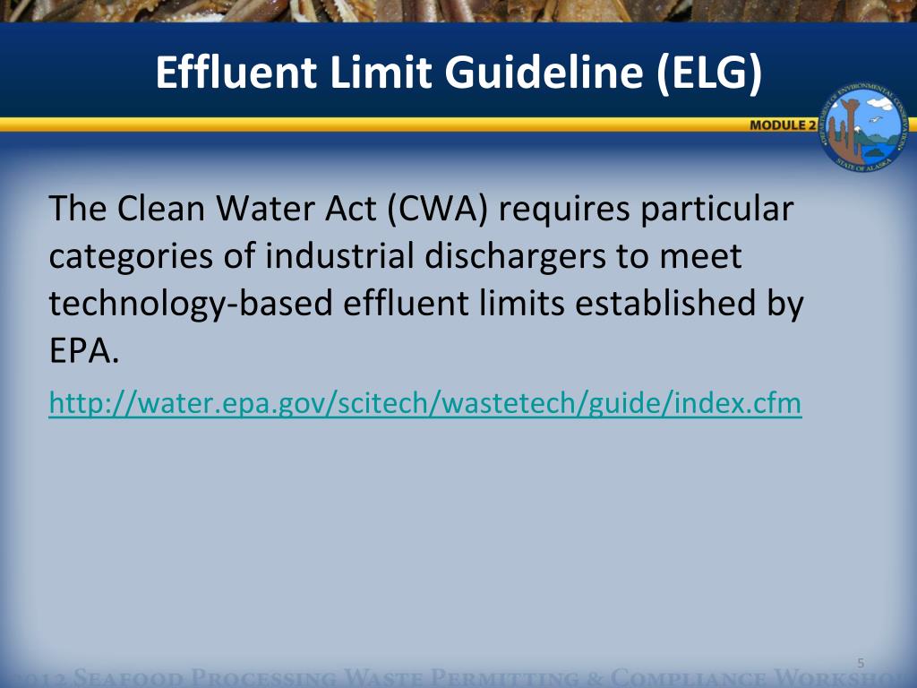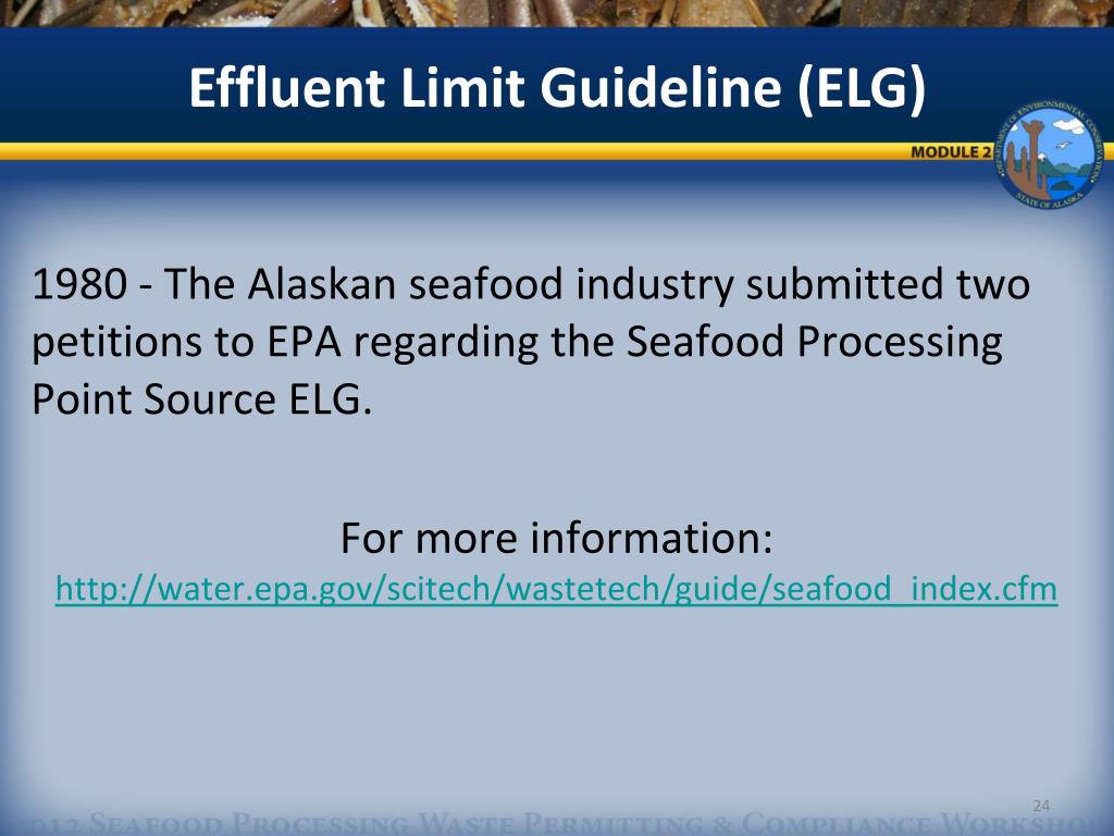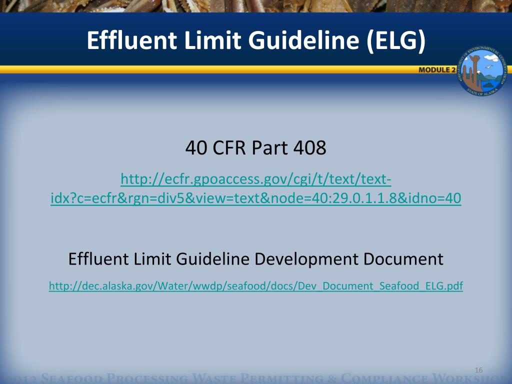 Effluent Limit Guideline (ELG) 40 CFR Part 408 http://ecfr.gpoaccess.gov/cgi/t/text/text-idx?c=ecfr&rgn=div5&view=text&node=40:29.0.1.1.8&idno=40 Effluent Limit Guideline Development Document http://dec.alaska.gov/Water/wwdp/seafood/docs/Dev_Document_Seafood_ELG.pdf