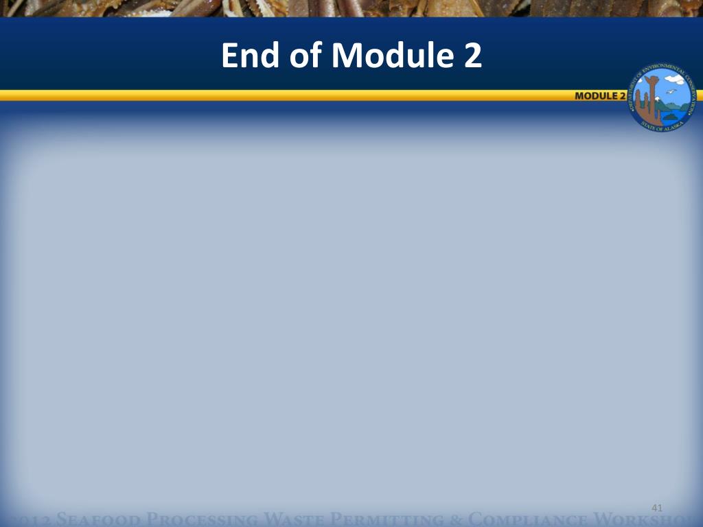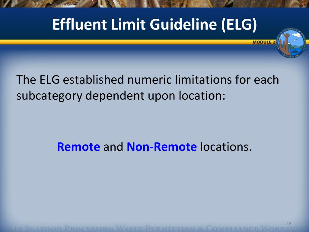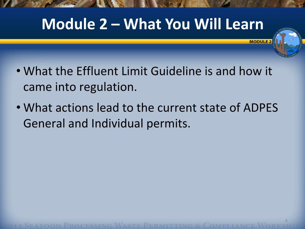 Module 2 – OBJECTIVES • Explain the Effluent Limit Guideline (ELG) History associated with the Seafood Point Source Category. • Review the NPDES seafood processing General Permits and Individual Permits in place at the time of Alaska primacy transfer (October 31, 2008).