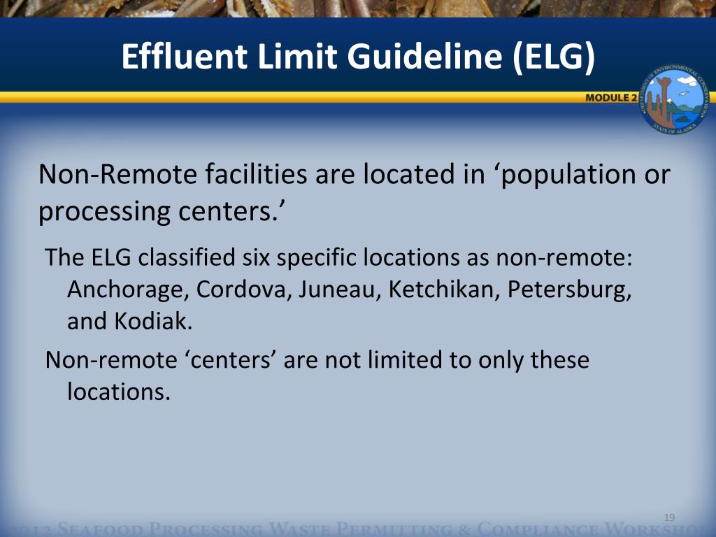 Effluent Limit Guideline (ELG) Non-Remote facilities are located in ‘population or processing centers.’ The ELG classified six specific locations as non-remote: Anchorage, Cordova, Juneau, Ketchikan, Petersburg, and Kodiak. Non-remote ‘centers’ are not limited to only these locations.