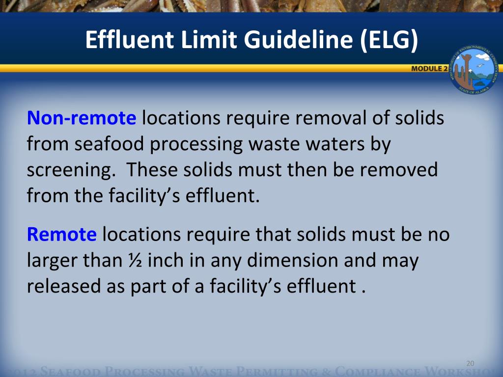 Effluent Limit Guideline (ELG) Non-remote locations require removal of solids from seafood processing waste waters by screening. These solids must then be removed from the facility’s effluent. Remote locations require that solids must be no larger than ½ inch in any dimension and may released as part of a facility’s effluent .