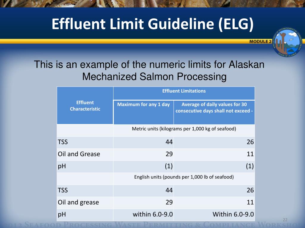 Effluent Limit Guideline (ELG) This is an example of the numeric limits for Alaskan Mechanized Salmon Processing