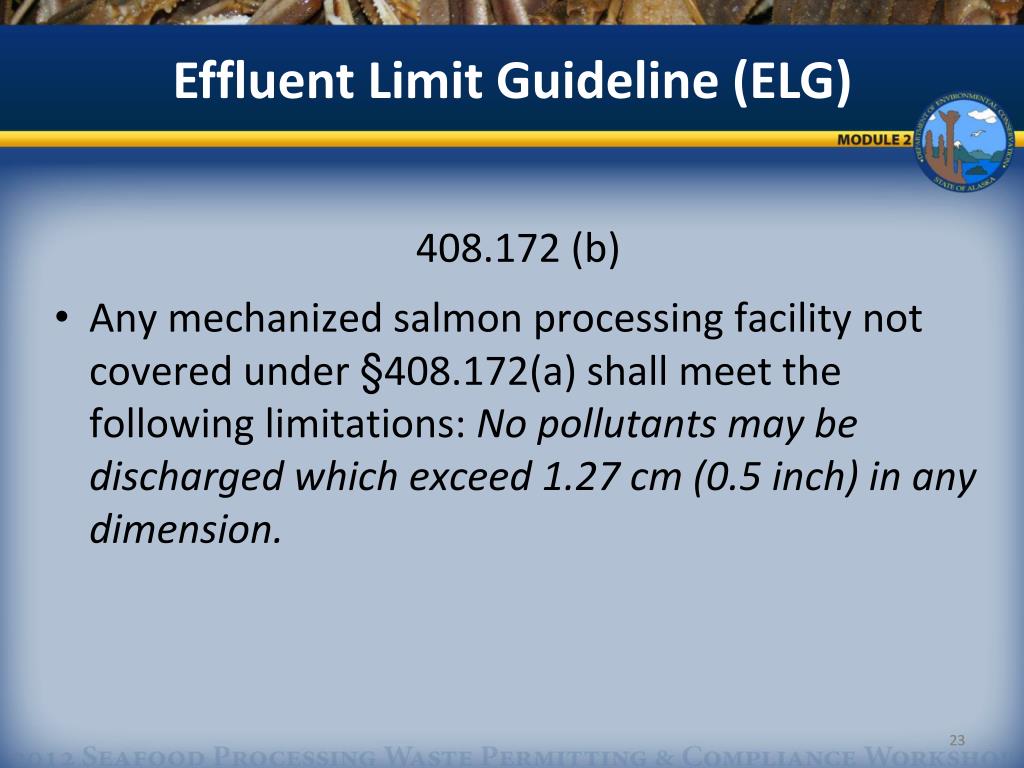 Effluent Limit Guideline (ELG) 408.172 (b) • Any mechanized salmon processing facility not covered under §408.172(a) shall meet the following limitations: No pollutants may be discharged which exceed 1.27 cm (0.5 inch) in any dimension. 23