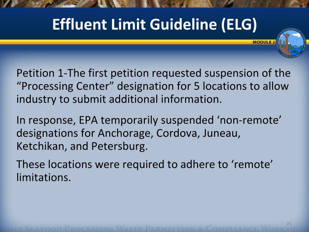 Effluent Limit Guideline (ELG) Petition 1-The first petition requested suspension of the “Processing Center” designation for 5 locations to allow industry to submit additional information. In response, EPA temporarily suspended ‘non-remote’ designations for Anchorage, Cordova, Juneau, Ketchikan, and Petersburg. These locations were required to adhere to ‘remote’ limitations.