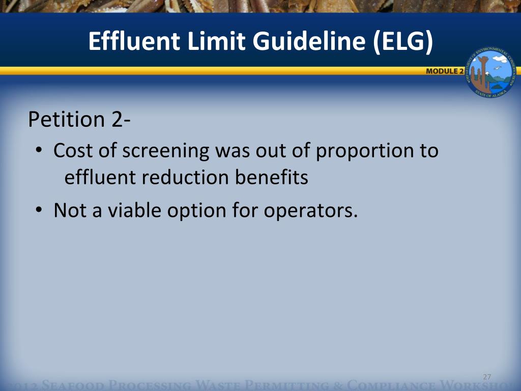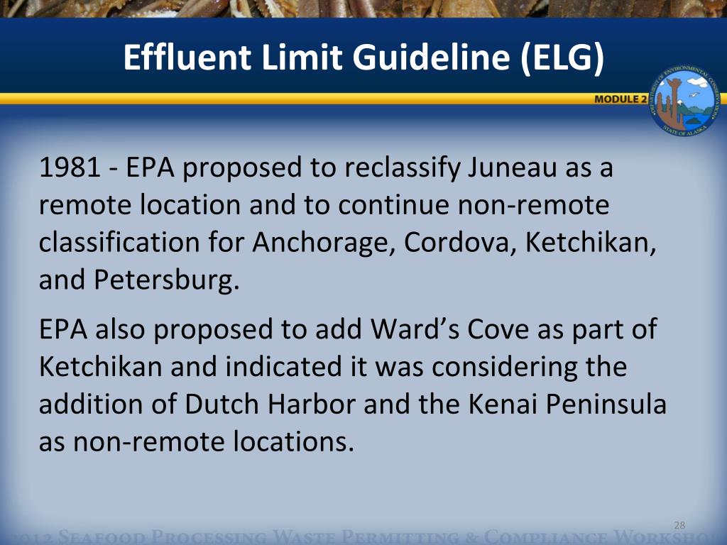 Effluent Limit Guideline (ELG) 1980 - The Alaskan seafood industry submitted two petitions to EPA regarding the Seafood Processing Point Source ELG. For more information: http://water.epa.gov/scitech/wastetech/guide/seafood_index.cfm
