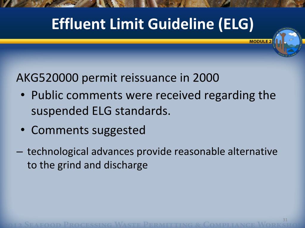 Effluent Limit Guideline (ELG) AKG520000 permit reissuance in 2000 • Public comments were received regarding the suspended ELG standards. • Comments suggested • technological advances provide reasonable alternative to the grind and discharge