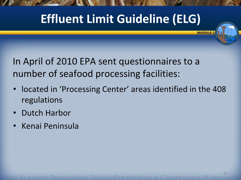 Effluent Limit Guideline (ELG) In April of 2010 EPA sent questionnaires to a number of seafood processing facilities: • located in ‘Processing Center’ areas identified in the 408 regulations • Dutch Harbor • Kenai Peninsula