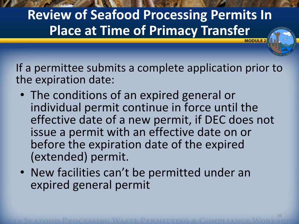 Review of Seafood Processing Permits In Place at Time of Primacy Transfer If a permittee submits a complete application prior to the expiration date: • The conditions of an expired general or individual permit continue in force until the effective date of a new permit, if DEC does not issue a permit with an effective date on or before the expiration date of the expired (extended) permit. • New facilities can’t be permitted under an expired general permit