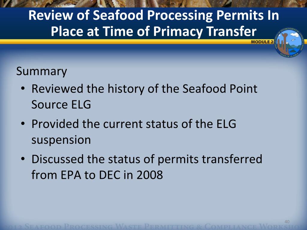 Review of Seafood Processing Permits In Place at Time of Primacy Transfer Summary • Reviewed the history of the Seafood Point Source ELG • Provided the current status of the ELG suspension • Discussed the status of permits transferred from EPA to DEC in 2008