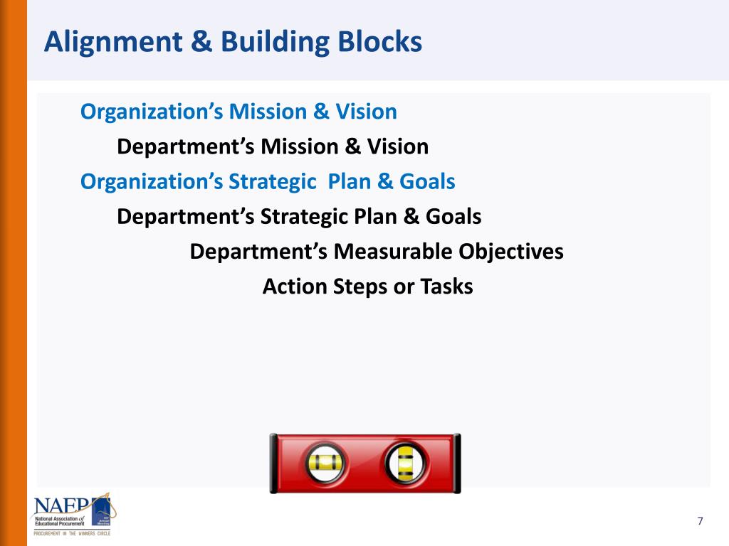 Alignment & Building Blocks Organization’s Mission & Vision Department’s Mission & Vision Organization’s Strategic Plan & Goals Department’s Strategic Plan & Goals Department’s Measurable Objectives Action Steps or Tasks