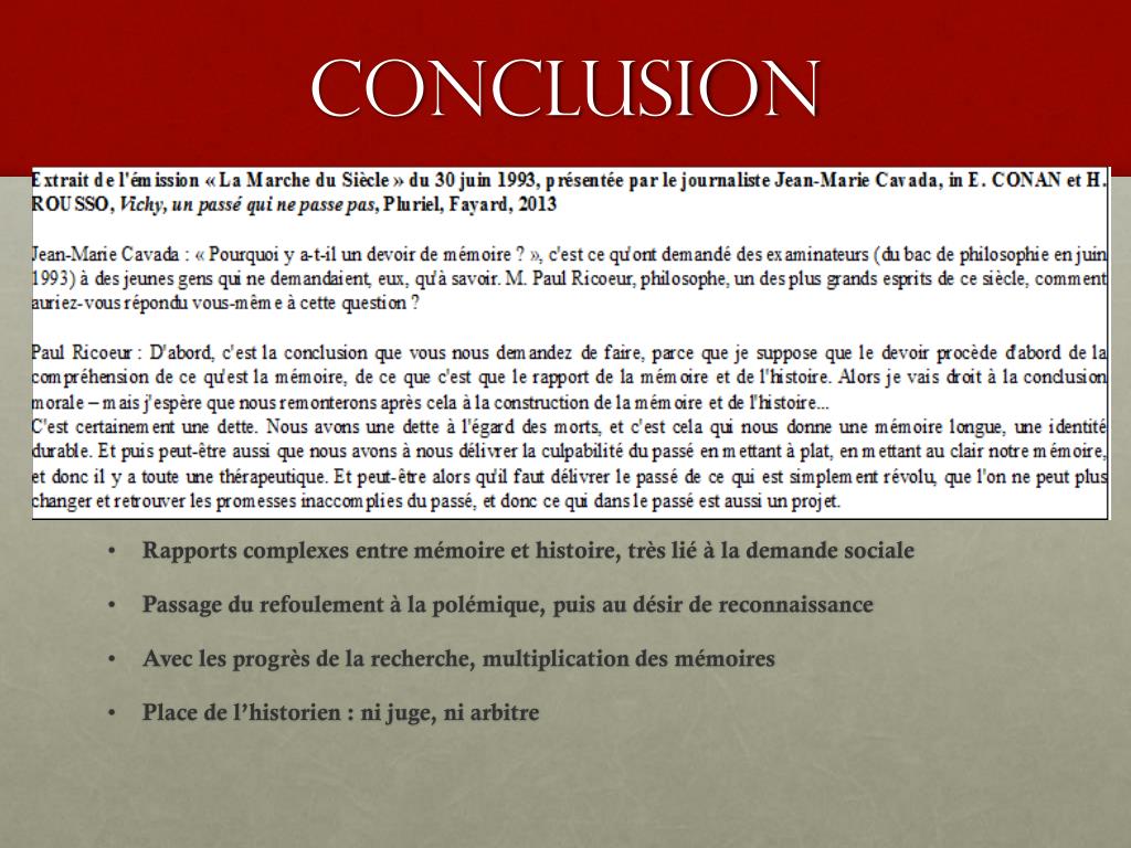 Conclusion • Rapports complexes entre mémoire et histoire, très lié à la demande sociale • Passage du refoulement à la polémique, puis au désir de reconnaissance • Avec les progrès de la recherche, multiplication des mémoires • Place de l’historien : ni juge, ni arbitre