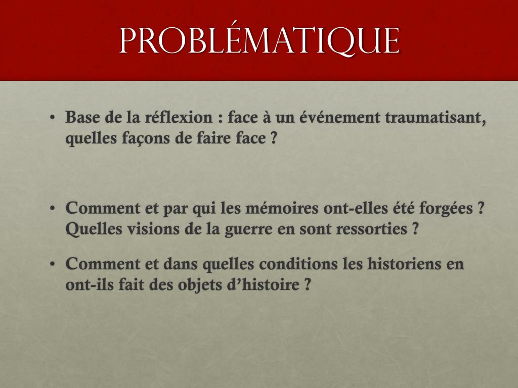 Problématique • Base de la réflexion : face à un événement traumatisant, quelles façons de faire face ? • Comment et par qui les mémoires ont-elles été forgées ? Quelles visions de la guerre en sont ressorties ? • Comment et dans quelles conditions les historiens en ont-ils fait des objets d’histoire ?
