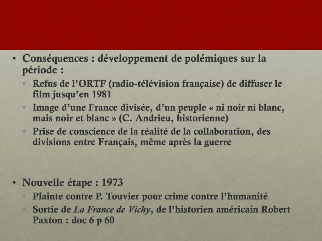 Conséquences : développement de polémiques sur la période : • Refus de l’ORTF (radio-télévision française) de diffuser le film jusqu’en 1981 • Image d’une France divisée, d’un peuple « ni noir ni blanc, mais noir et blanc » (C. Andrieu, historienne) • Prise de conscience de la réalité de la collaboration, des divisions entre Français, même après la guerre • Nouvelle étape : 1973 • Plainte contre P. Touvier pour crime contre l’humanité • Sortie de La France de Vichy, de l’historien américain Robert Paxton : doc 6 p 60
