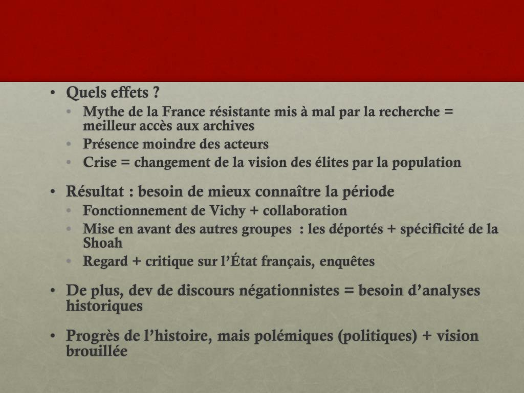 Quels effets ? • Mythe de la France résistante mis à mal par la recherche = meilleur accès aux archives • Présence moindre des acteurs • Crise = changement de la vision des élites par la population • Résultat : besoin de mieux connaître la période • Fonctionnement de Vichy + collaboration • Mise en avant des autres groupes : les déportés + spécificité de la Shoah • Regard + critique sur l’État français, enquêtes • De plus, dev de discours négationnistes = besoin d’analyses historiques • Progrès de l’histoire, mais polémiques (politiques) + vision brouillée