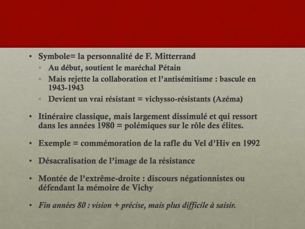 Symbole= la personnalité de F. Mitterrand • Au début, soutient le maréchal Pétain • Mais rejette la collaboration et l’antisémitisme : bascule en 1943-1943 • Devient un vrai résistant = vichysso-résistants (Azéma) • Itinéraire classique, mais largement dissimulé et qui ressort dans les années 1980 = polémiques sur le rôle des élites. • Exemple = commémoration de la rafle du Vel d’Hiv en 1992 • Désacralisation de l’image de la résistance • Montée de l’extrême-droite : discours négationnistes ou défendant la mémoire de Vichy • Fin années 80 : vision + précise, mais plus difficile à saisir.