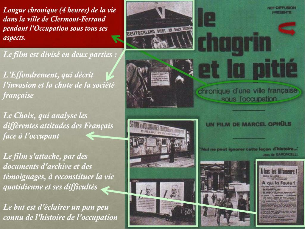 Longue chronique (4 heures) de la vie dans la ville de Clermont-Ferrand pendant l'Occupation sous tous ses aspects. Le film est divisé en deux parties : L'Effondrement, qui décrit l'invasion et la chute de la société française Le Choix, qui analyse les différentes attitudes des Français face à l'occupant Le film s'attache, par des documents d'archive et des témoignages, à reconstituer la vie quotidienne et ses difficultés Le but est d'éclairer un pan peu connu de l'histoire de l'occupation